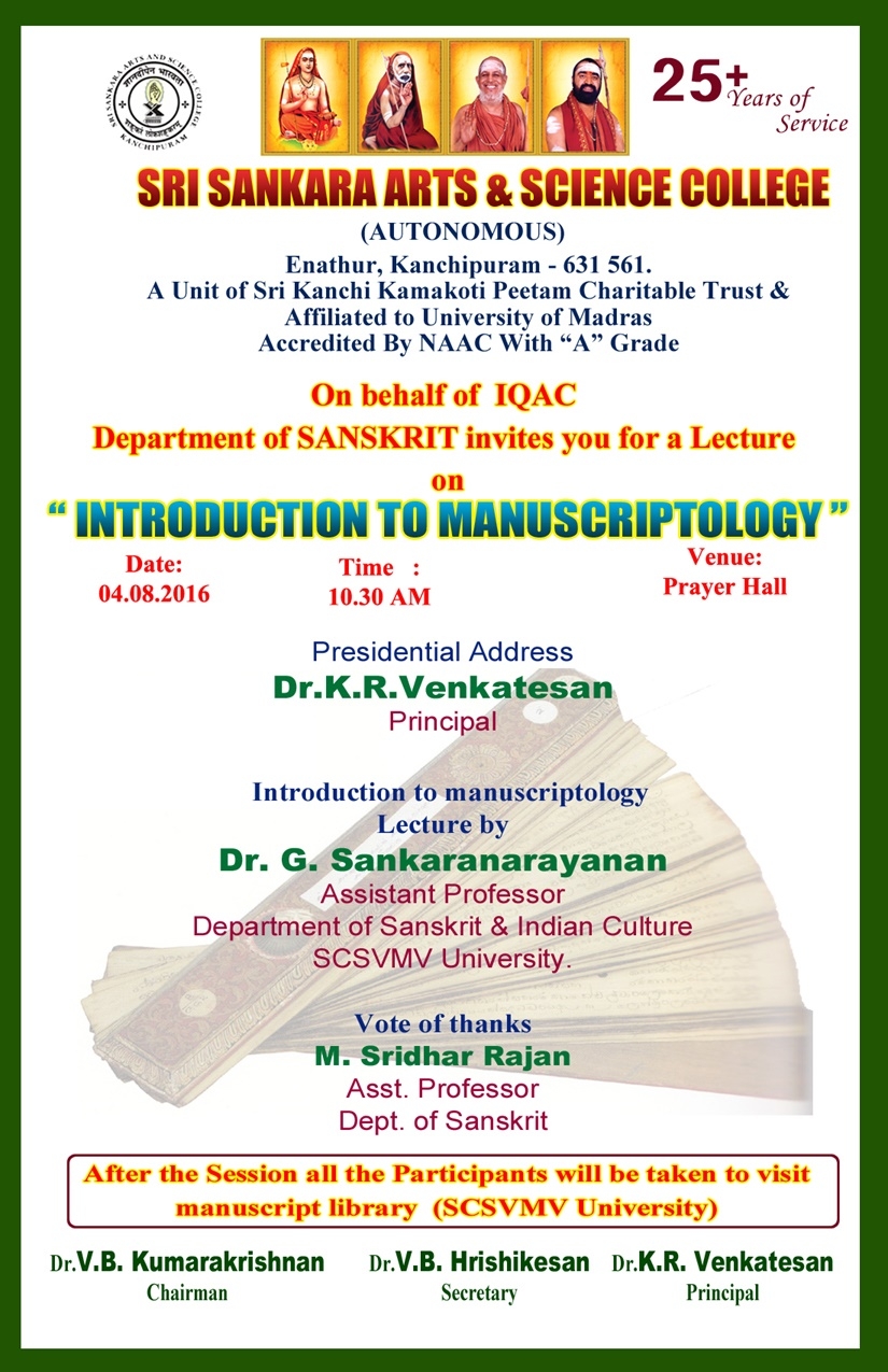 On behalf of IQAC Department of Sanskrit Invites you for a Lecture on “INTRODUCTION TO MANUSCRIPTOLOGY” by Dr. G.Sankaranarayanan Assistant Professor, Department of Sanskrit & Indian Culture, SCSVMV University DATE : 04.08.2016 TIME : 10.30 AM VENUE: Prayer Hall