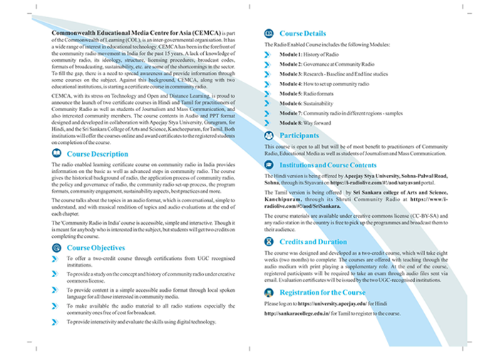 This course is open to all, but will be of most benefit to practitioners of Community Radio, Educational Media as well as students of Journalism and Mass Communication.