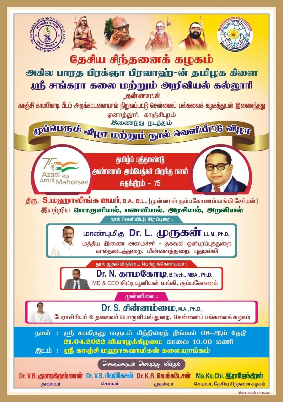 தேசிய சிந்தனைக் கழகம் மற்றும் ஸ்ரீ சங்கரா கலை மற்றும் அறிவியல் கல்லூரி இணைந்து நடத்தும் முப்பெரும் விழா மற்றும் நூல் வெளியீட்டு விழா நாள் : 21.04.2022 வியாழக்கிழமை காலை 10.00 மணி