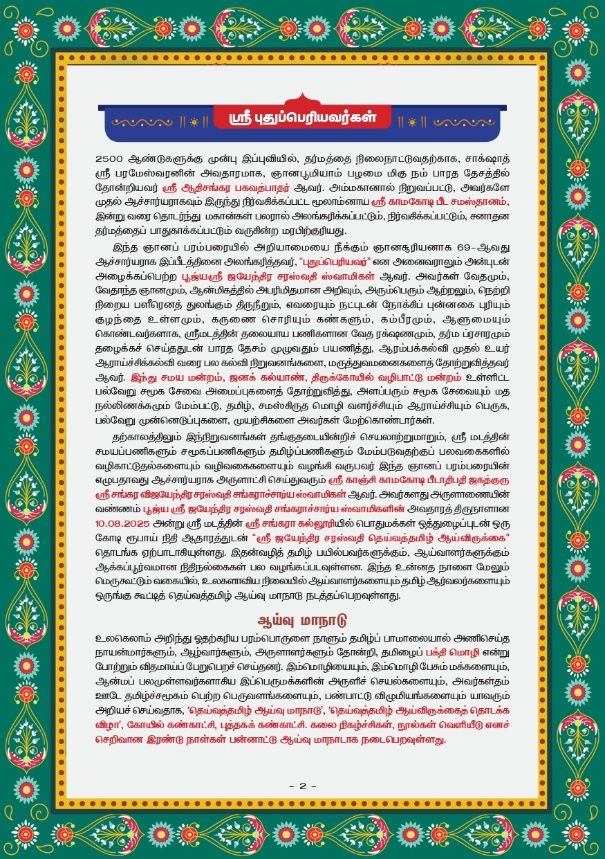 பூஜ்யஸ்ரீ ஜெயேந்திர சரஸ்வதி சங்கராச்சார்ய ஸ்வாமிகள் ஜெயந்தி விழா- தெய்வத்தமிழ் ஆய்வு மாநாடு