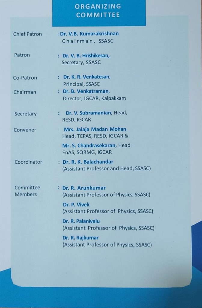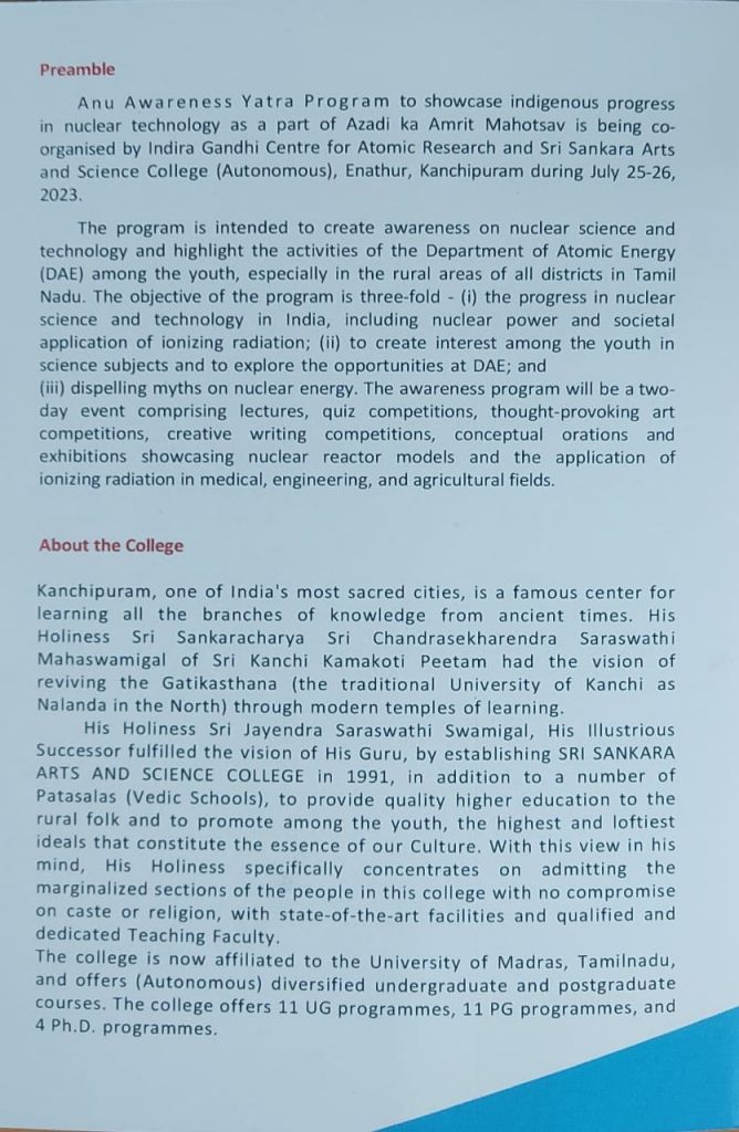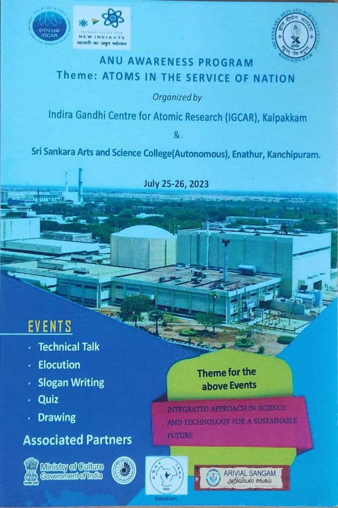 ANU AWARENESS PROGRAM – Theme : ATOMS IN THE SERVICE OF NATION Organized by Indira Gandhi Centre for Atomic Research(IGCAR), Kalpakkam & Sri Sankara Arts and Science College Date : July 25-26,2023